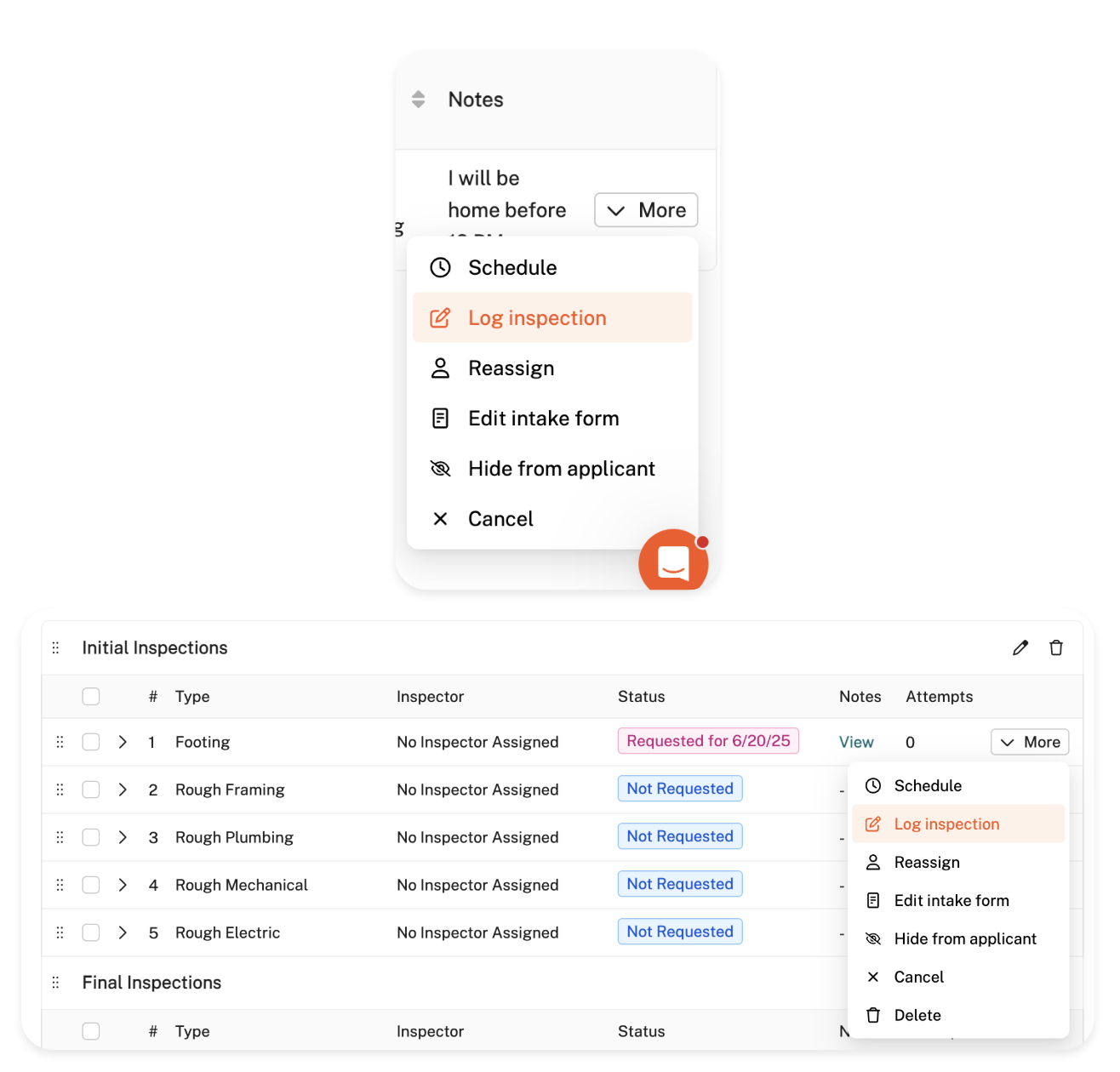 This option allows you to schedule or log an inspection directly from the table view. We'll cover inspections in more detail later in this guide, but it's worth noting that this functionality is also available here!