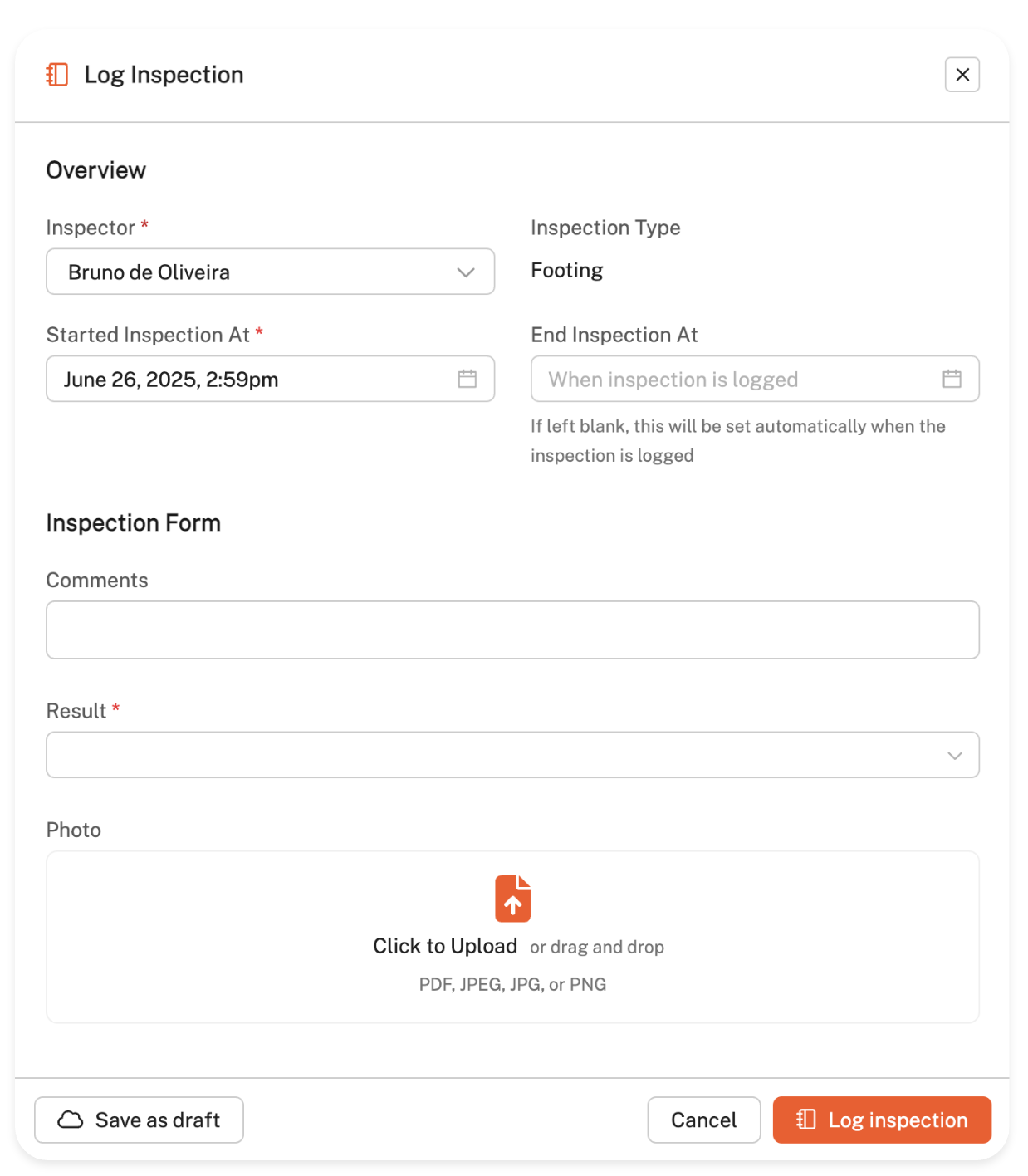 Inspector: select which inspector completed the inspection. It auto-populates to the current inspector by default. This is particularly useful when you're logging the inspection on behalf of someone else