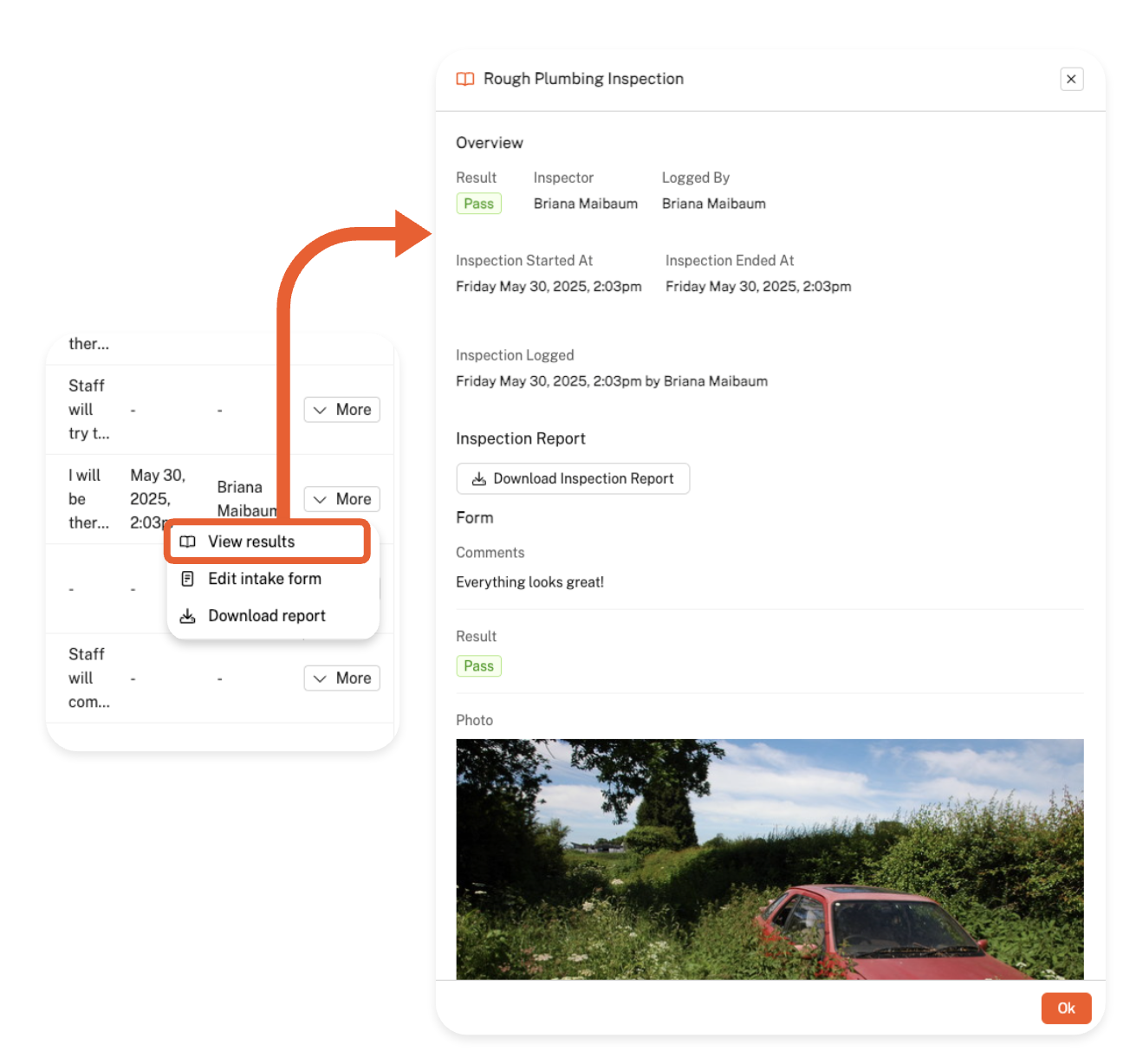 You can check the results of your logged inspections by clicking the More dropdown menu on the right side of the table view and selecting View Results.