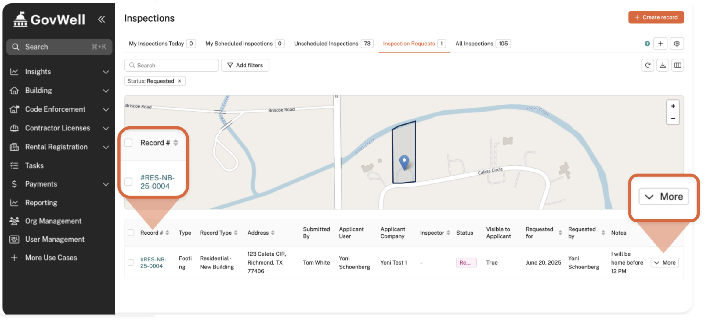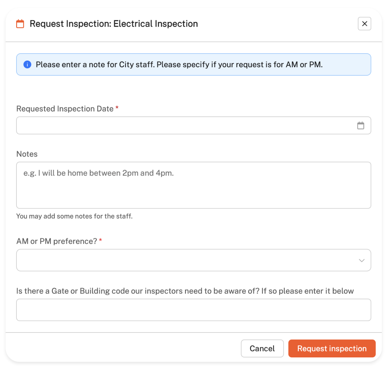 Within GovWell, applicants have two options for managing their inspections: they can either schedule an inspection themselves or submit a request for one (for more details check out our Help Center Article: Requesting vs Scheduling an inspection).