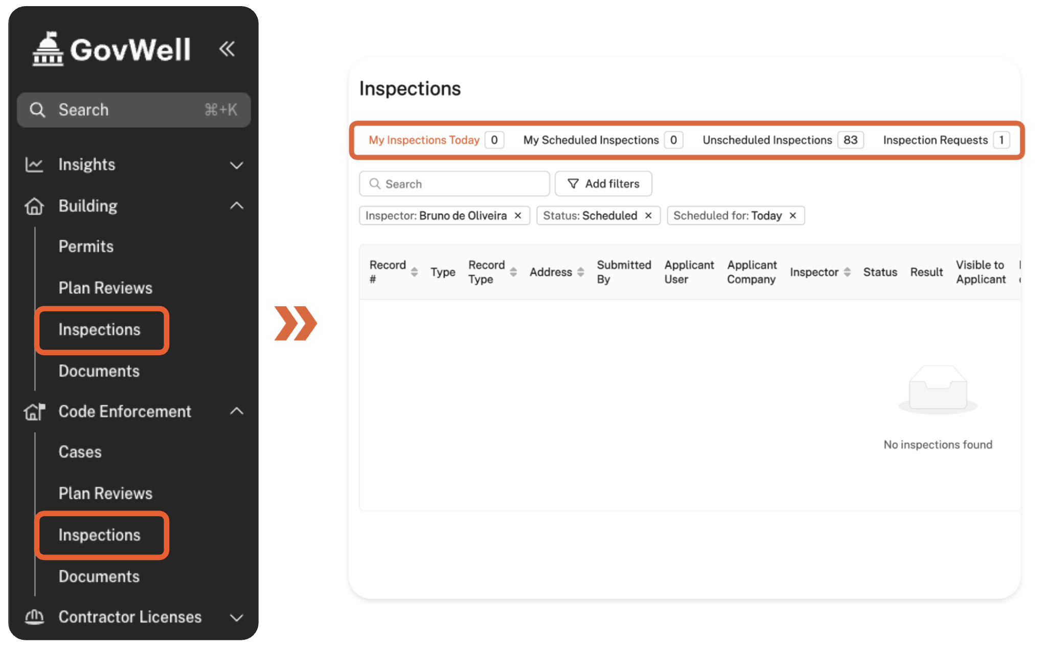 Another way to track your inspections is by navigating to the Inspections page within the module you're working on. From there, you can use the available views to monitor inspection requests, scheduled and unscheduled inspections, and other related entries.