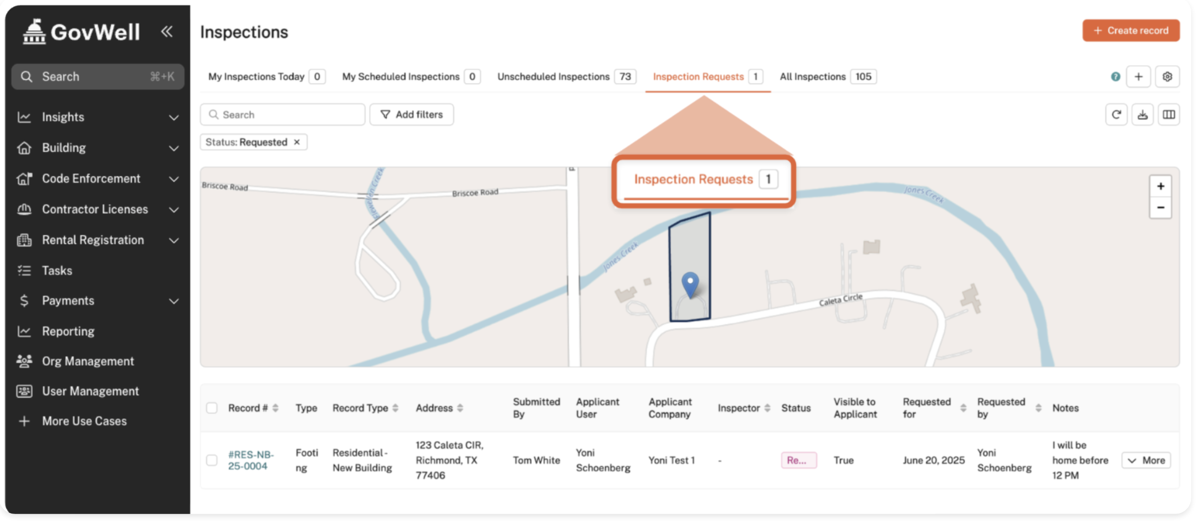 From the Inspections page in the module you're working on, look for the Inspection Requests tab. You'll see a list of inspections that were requested by applicants
