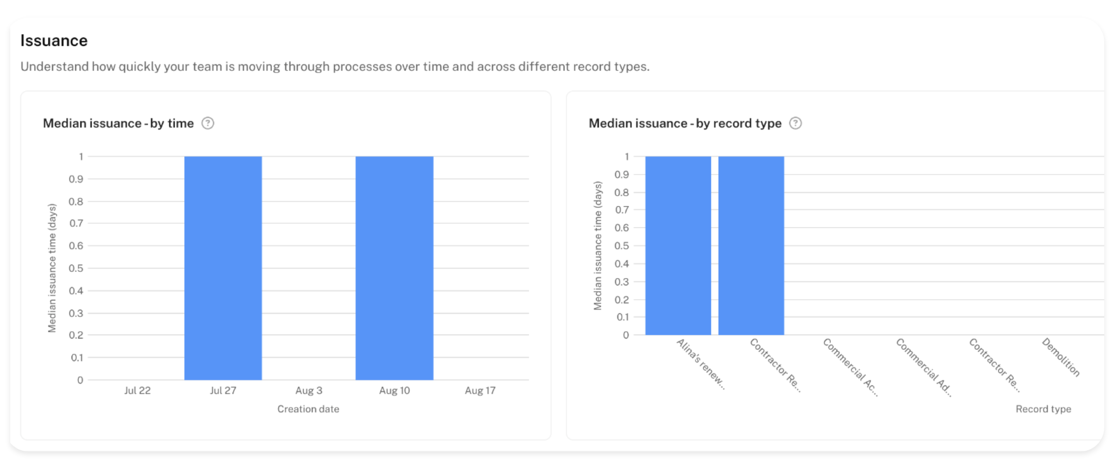 The next group offers you a view of the issuance patterns, helping you understand how quickly your team is moving through processes over time and across different record types.