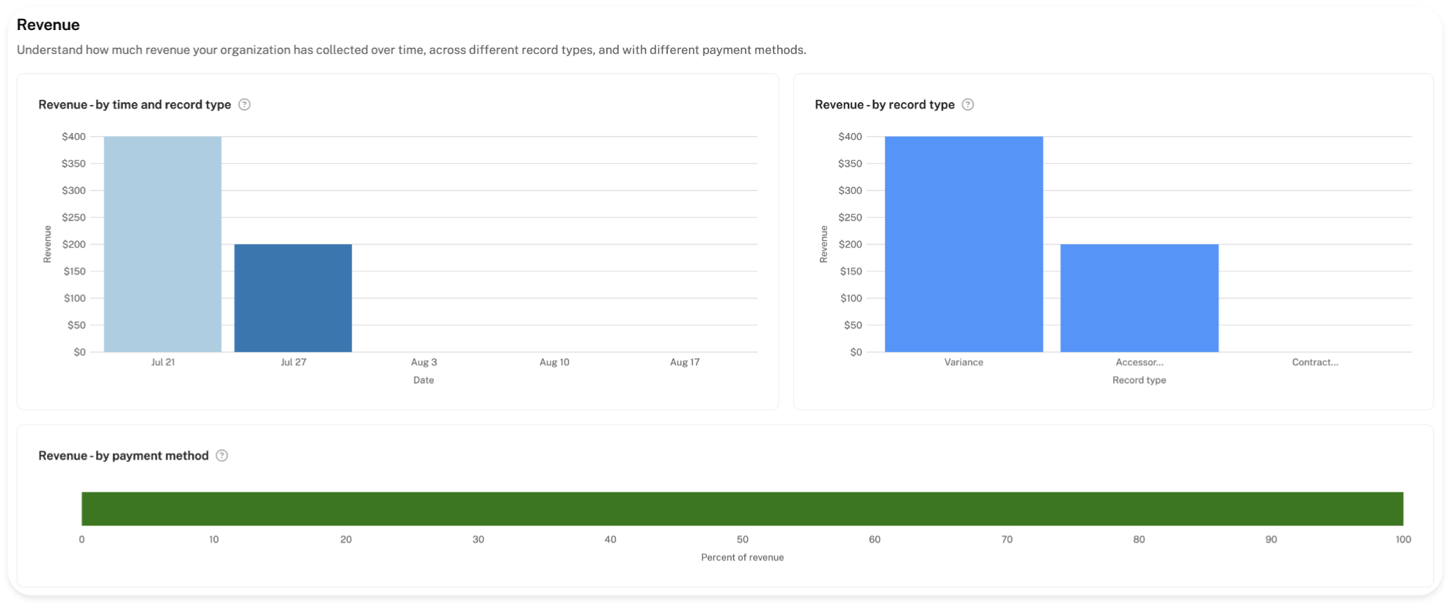 In this group, a comprehensive overview of how much revenue your organization has collected over time, across the selected record type(s), categorized by different payment methods.