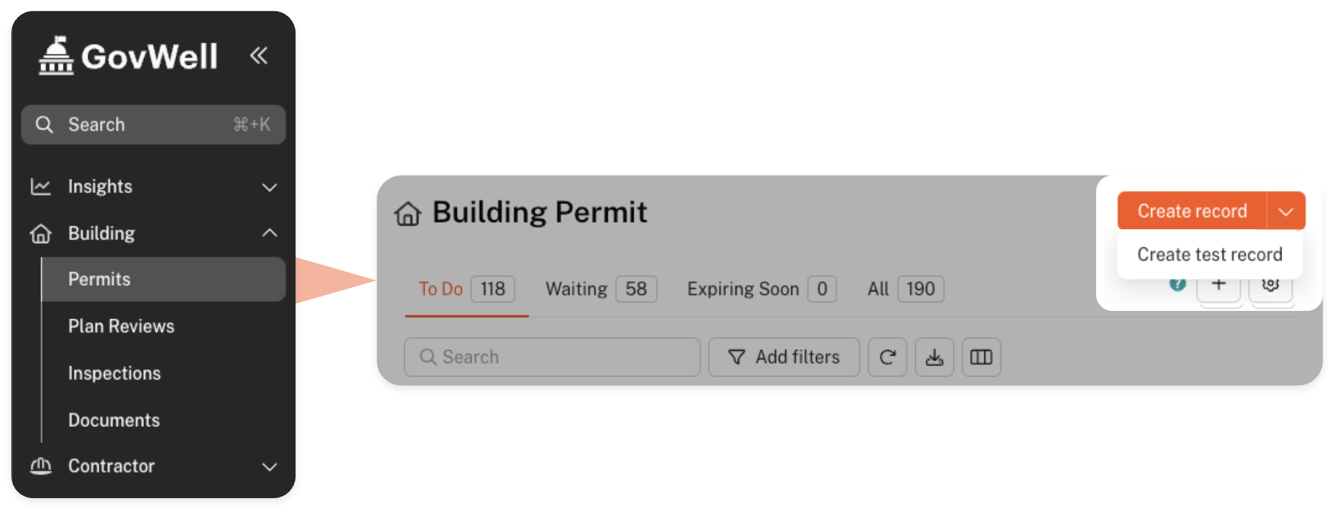 Look for the 'Permits' page in your module block - in this case, the Building block - and click the downwards arrow next to 'Create Record' and select 'Create Test Record'