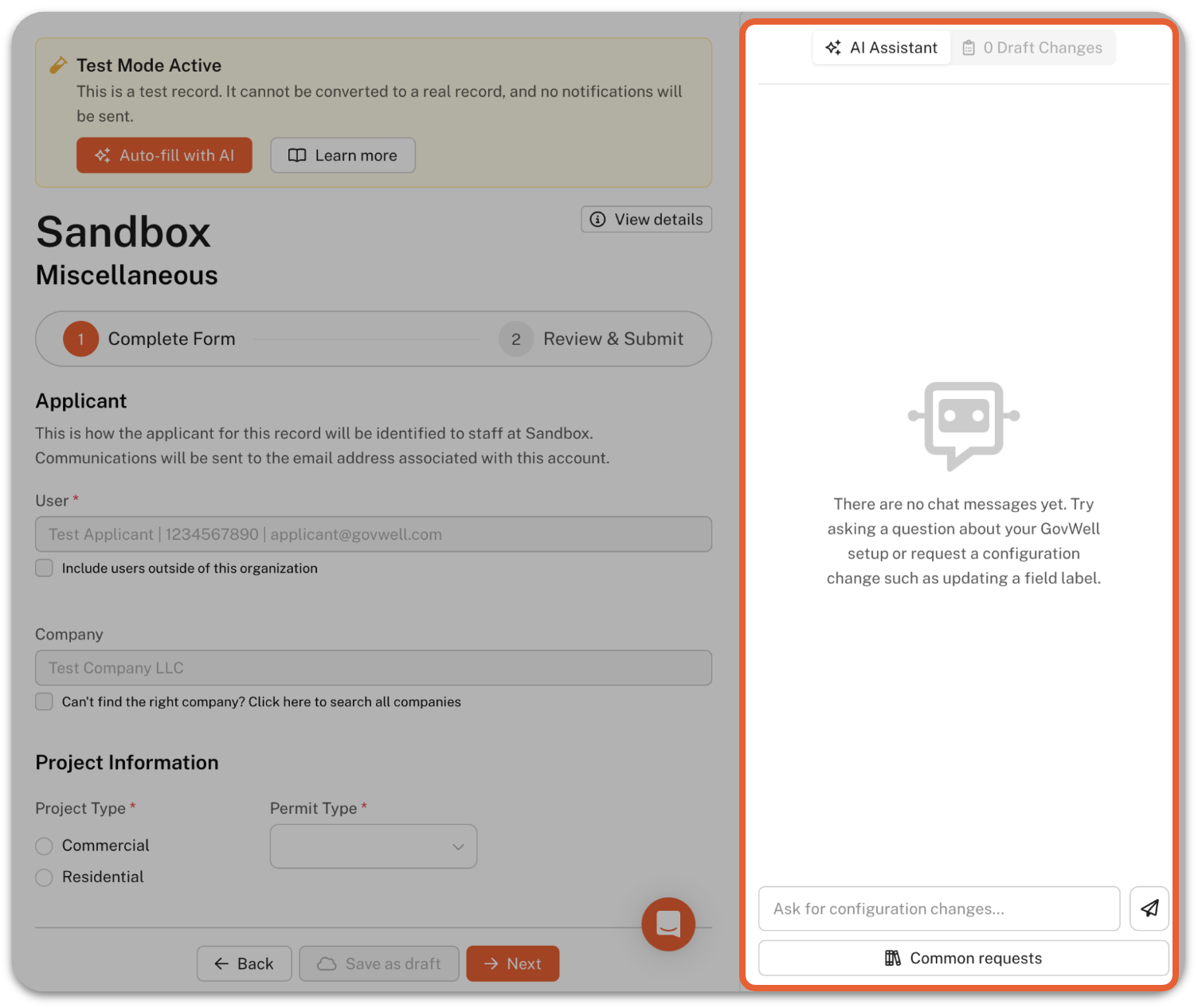 Your AI Configuration Assistant will appear on the right side of your Test Record Application