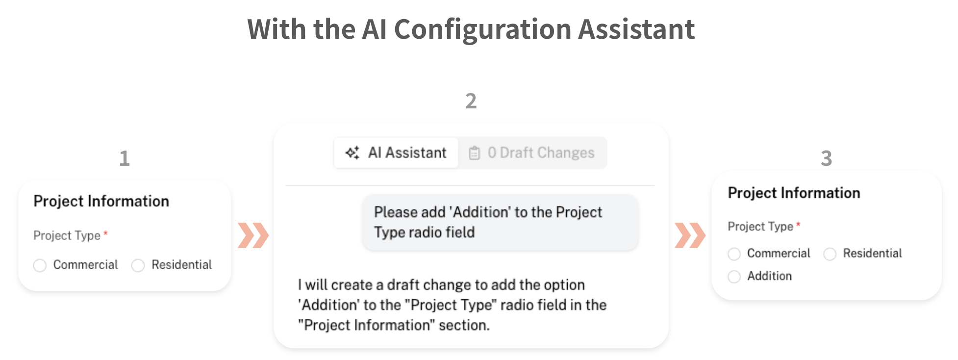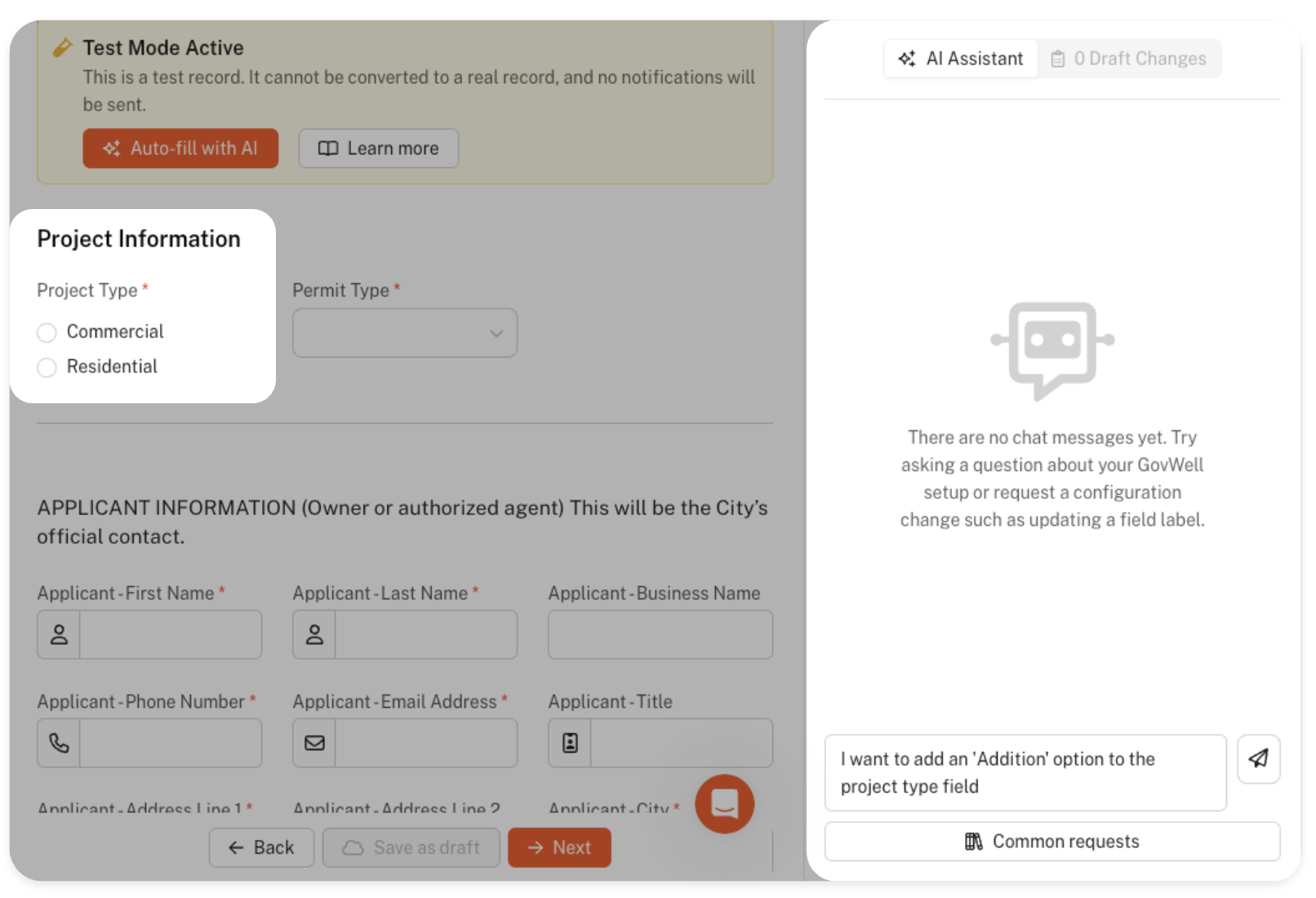 Using the AI Configuration Assistant is incredibly easy! In the chat window, start by writing down the change you'd like to make to your application form. In this case, let's try to add an 'Addition' option in the Project Type radio field.