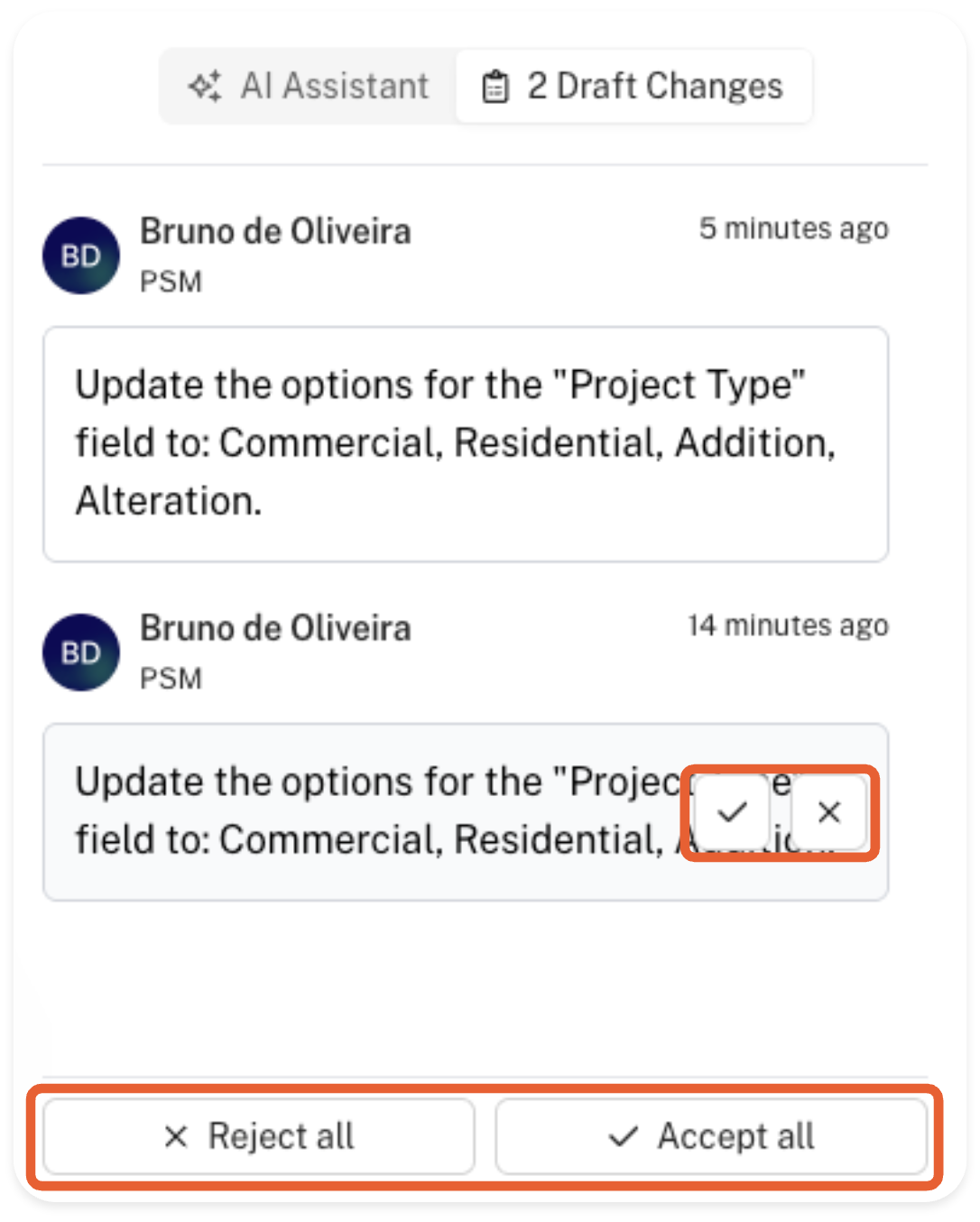 Once you're ready to review the changes, click 'Review pending draft change' or the '# draft changes' to review the changes and accept/reject them.