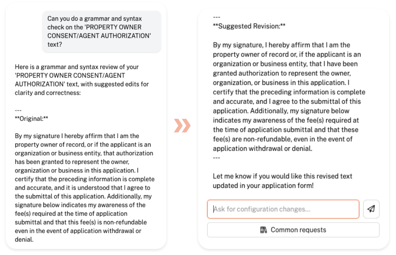 The Configuration Assistant can also check and make grammar and syntax revisions to any text in your application. Simply ask for it and the assistant will share a copy of the original and a suggested revision for comparison!