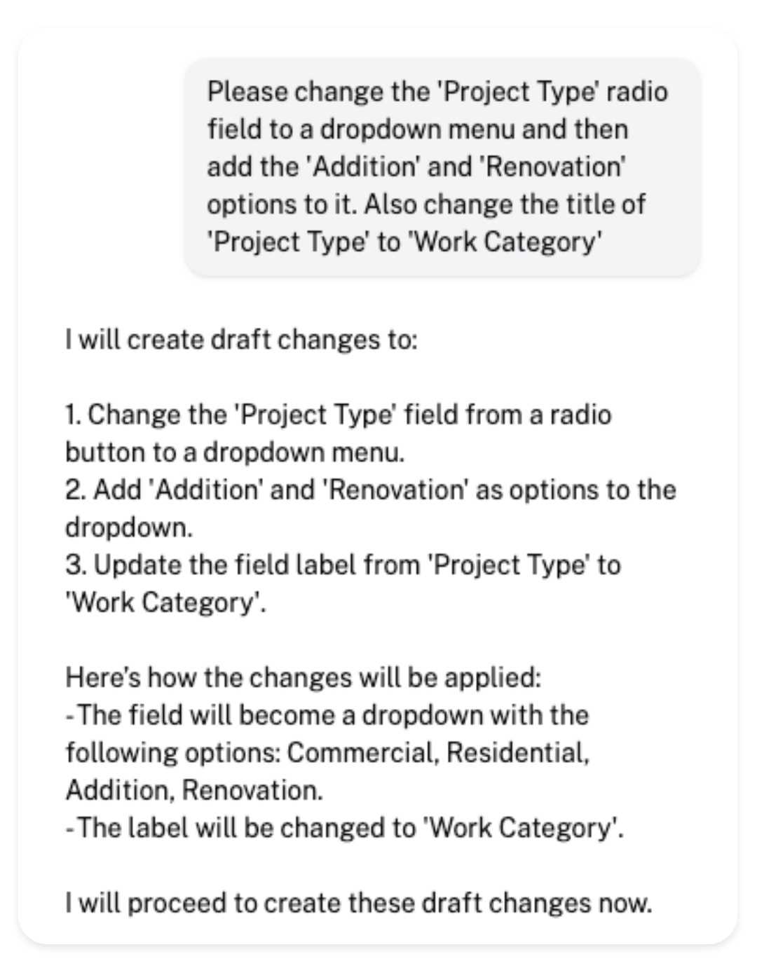 The assistant will analyze the instruction and return a proposed action. Any proposed actions will be saved as a draft for review - in this case, the assistant has proposed the action to add the 'Addition' option to the 'Project Type' field, which will result in the field having three options instead of two.