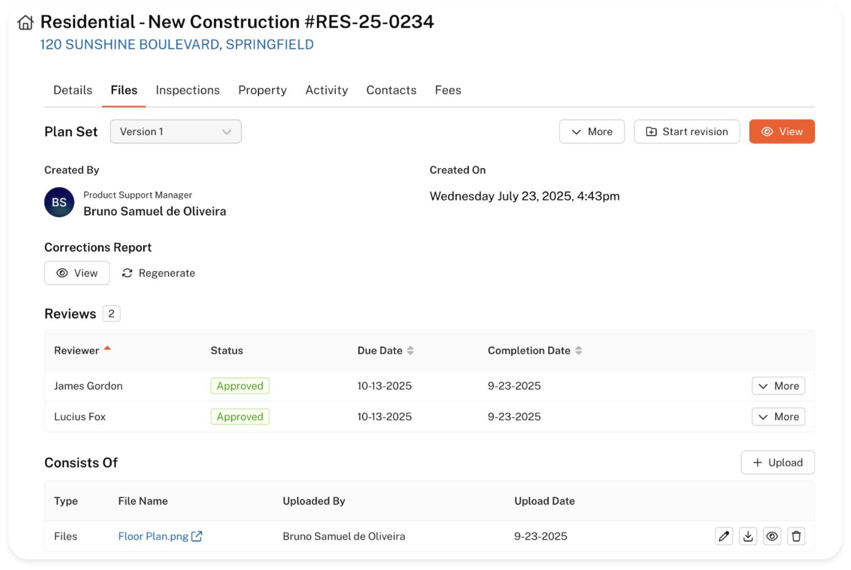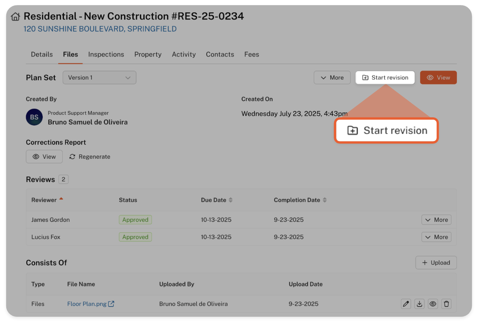 Applicants can also request a plan revision under the same circumstances reviewers can. When the most recent plan review is marked as complete, an option to start a revision will be available on the Files tab