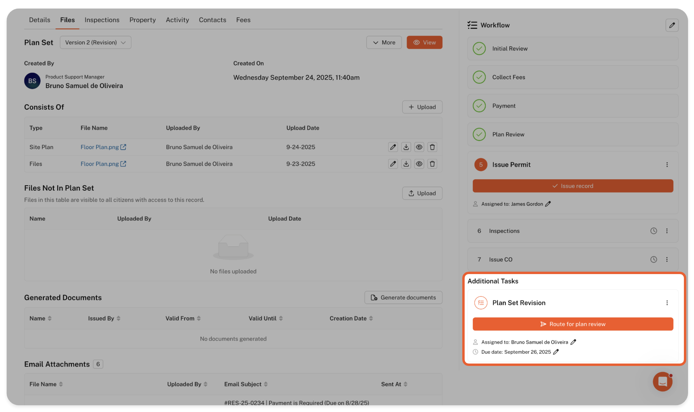 Create Plan Revision – Upload the revised files directly to the plan set. Applicant input is not required; simply upload the files to the revision and route it for plan review.